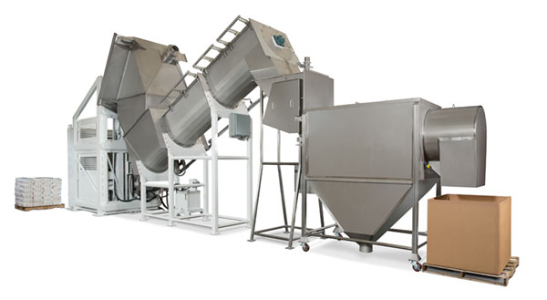 NBE high-throughput packaged product reclaim systems bring to continuous-process operations, or plants running high-volume package filling lines, a product and packaging recovery system engineered and built specifically to the performance requirements of these demanding conditions. Capable of processing multi-package recovery cycles in excess of 2,000 pounds each, NBE high-throughput product reclaim systems reduce material loss and packaging waste at exceptional throughput rates.